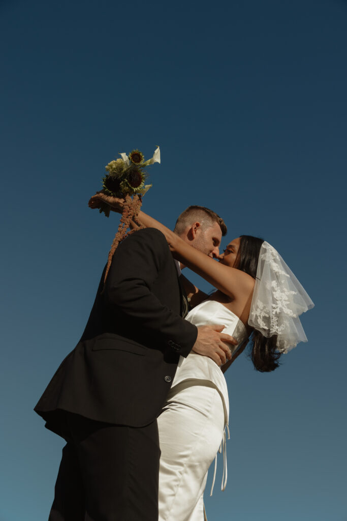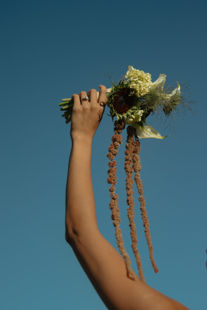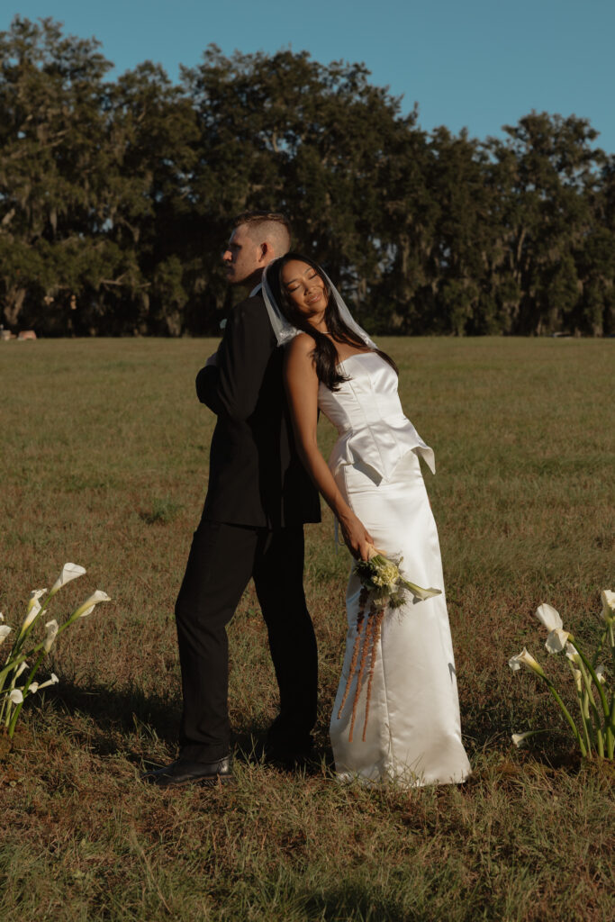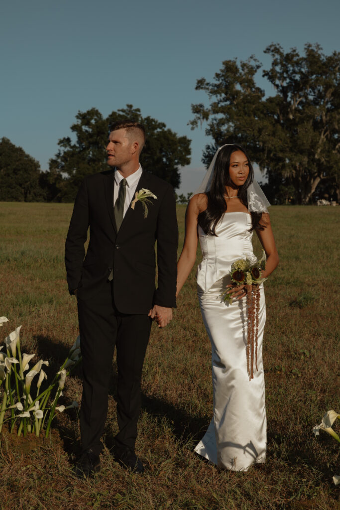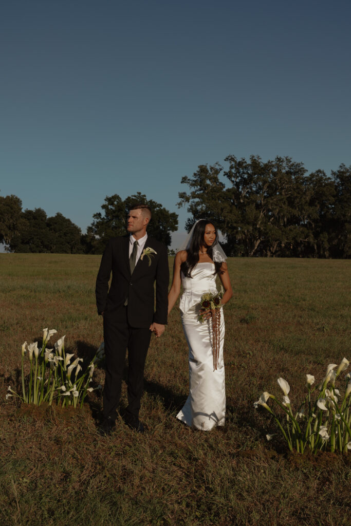 The second concept embraced a chic fall field editorial vibe. Golden light spilled across the open land, warming layers of autumn foliage and casting soft shadows across the fields. Calla lilies framed the ceremony space, adding a sculptural, modern touch that felt clean yet romantic against the open landscape. A short veil and refined styling kept the look intentional and fashion-forward without feeling overdone.