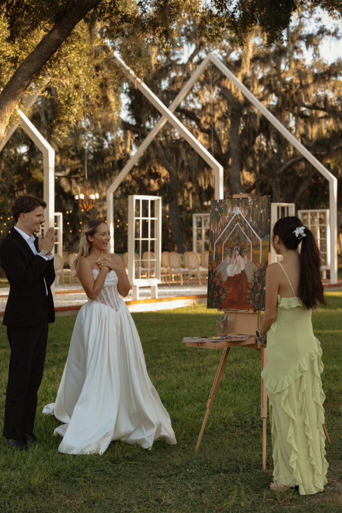 Behind the scenes, hair and makeup unfolded quietly and effortlessly, with soft, natural glam coming together as light filtered through the open space. Details were refined without feeling rushed, allowing moments to unfold organically. The live painter worked in real time, capturing the emotion and energy of the day as it happened, while the content creator documented the process in a way that highlighted both the artistry and the experience.