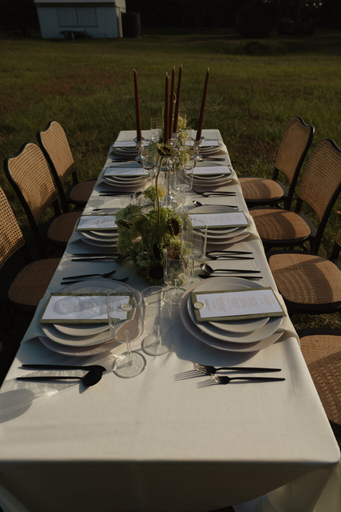For the reception, a long rectangular table set the tone. Candlesticks, rich fall florals, and thoughtful place settings created a moody but elevated tablescape that felt both seasonal and timeless. Instead of a traditional cake, a tiramisu tower served in coupe glasses added an effortless, European-inspired moment. From wide, sun-soaked fields to intimate tableside details, this concept highlighted how seamlessly Flora Groves Farm carries fall weddings with warmth, style, and ease.